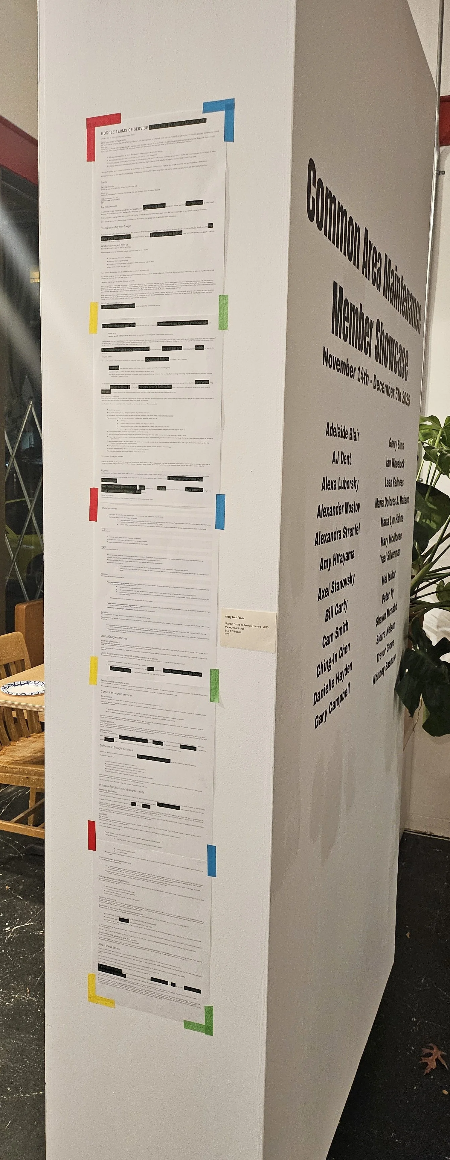 In addition to “Principles,” this showcase included an erasure from Google Terms of Service that shows how often the words “follow,” “permission,” and “comply” are used — and the nearby text that accompanies it