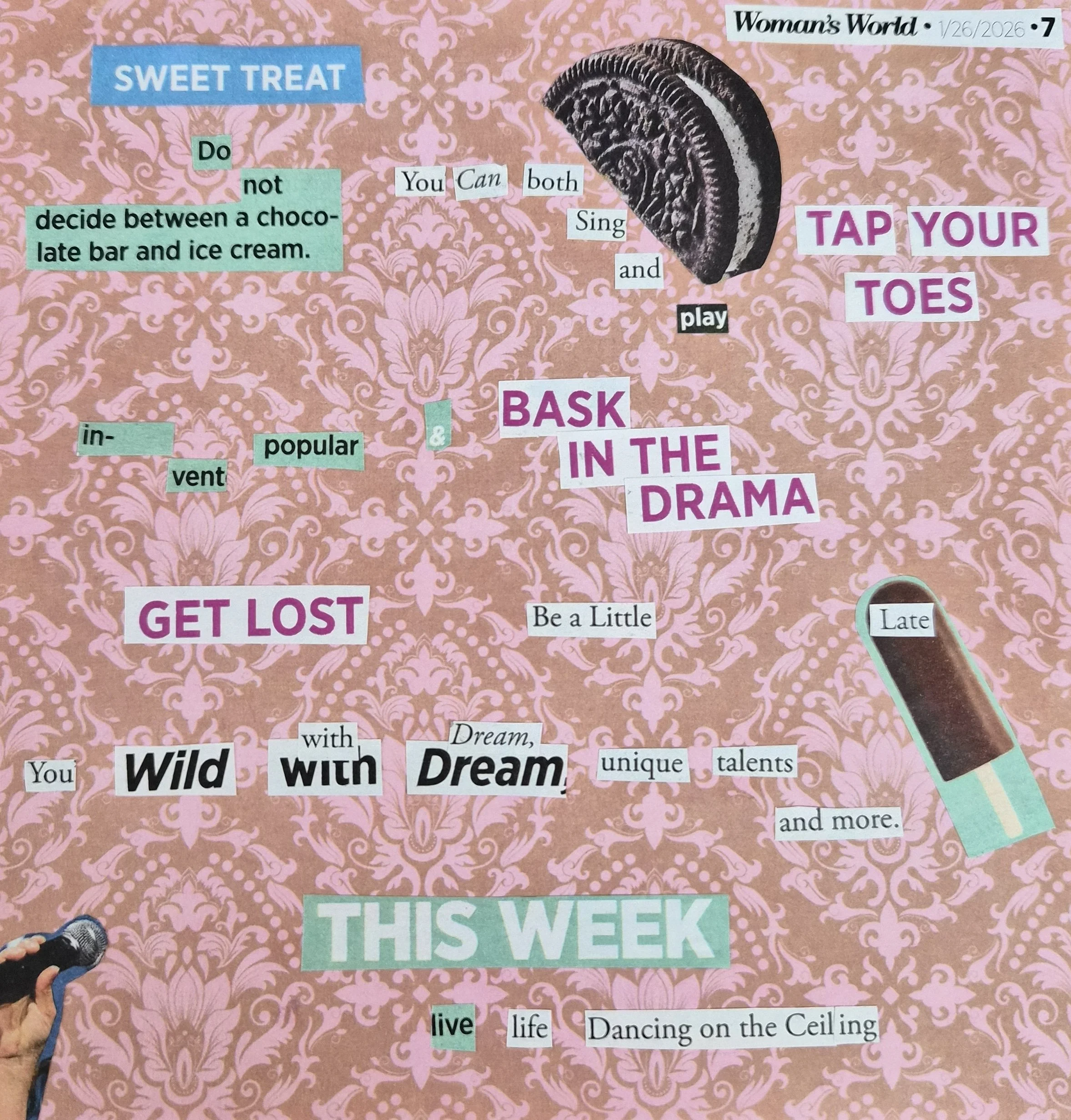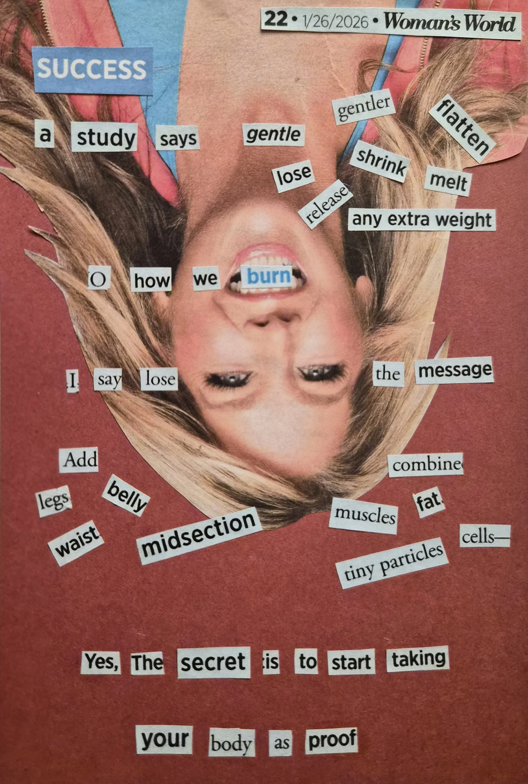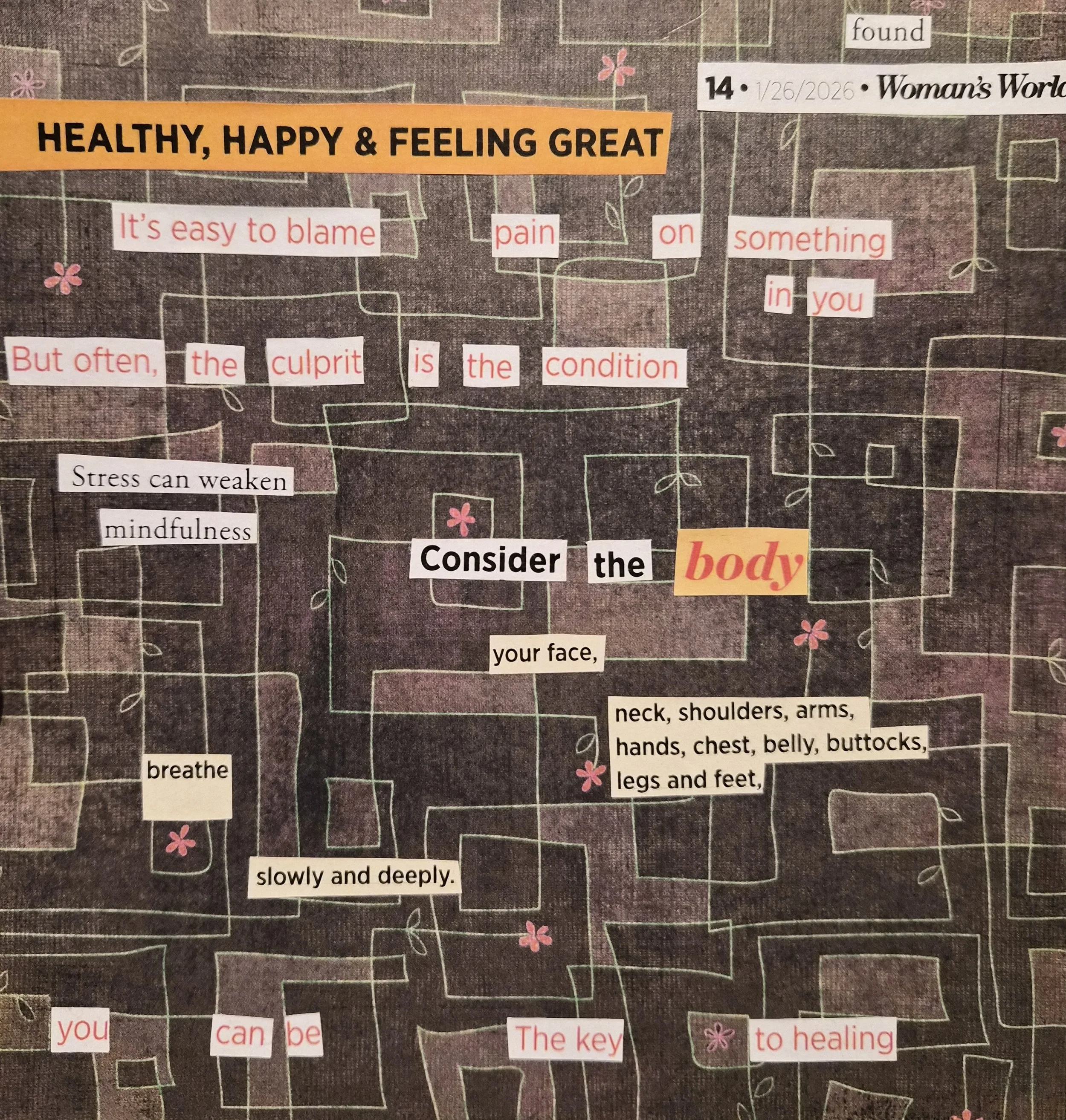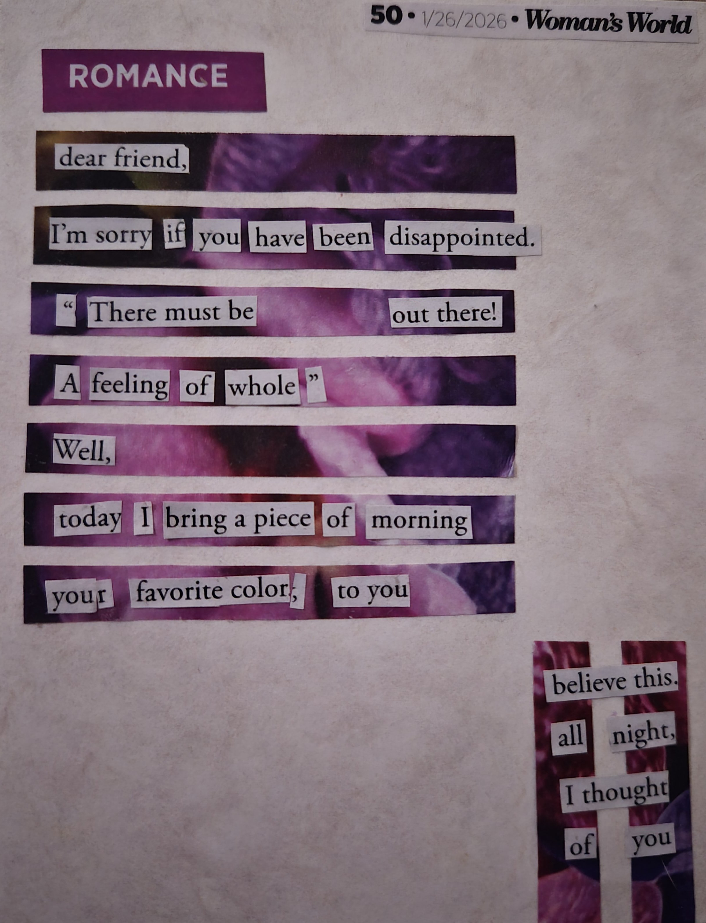 As part of Stem and Story’s Rebloom flower subscription for the month of February 2026, I created self-love Valentine’s Day messages by cutting out and rearranging words from Woman’s World magazine, taking phrases like “Walk Off A Meno Belly,” and deciding which part, if any, can stay.