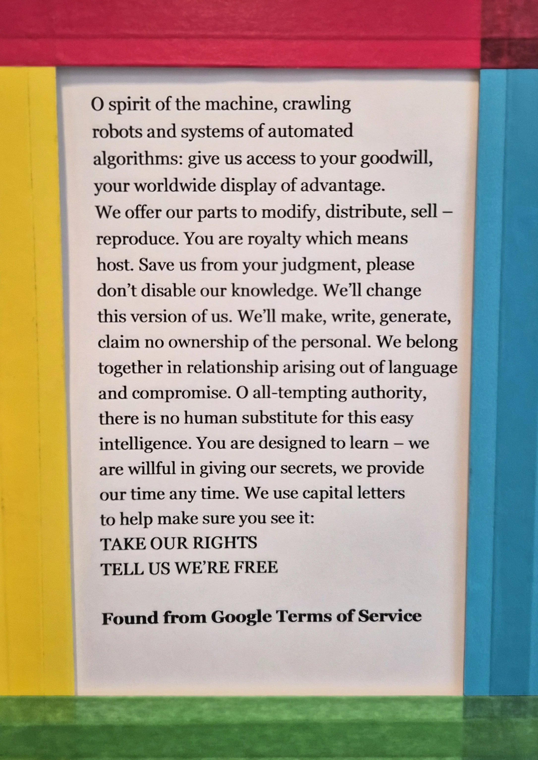 Found poems take existing texts and refashion them, reorder them, and present them as poems. The literary equivalent of a collage… A pure found poem consists exclusively of outside texts: the words of the poem remain as they were found, with few additions or omissions. Decisions of form, such as where to break a line, are left to the poet.